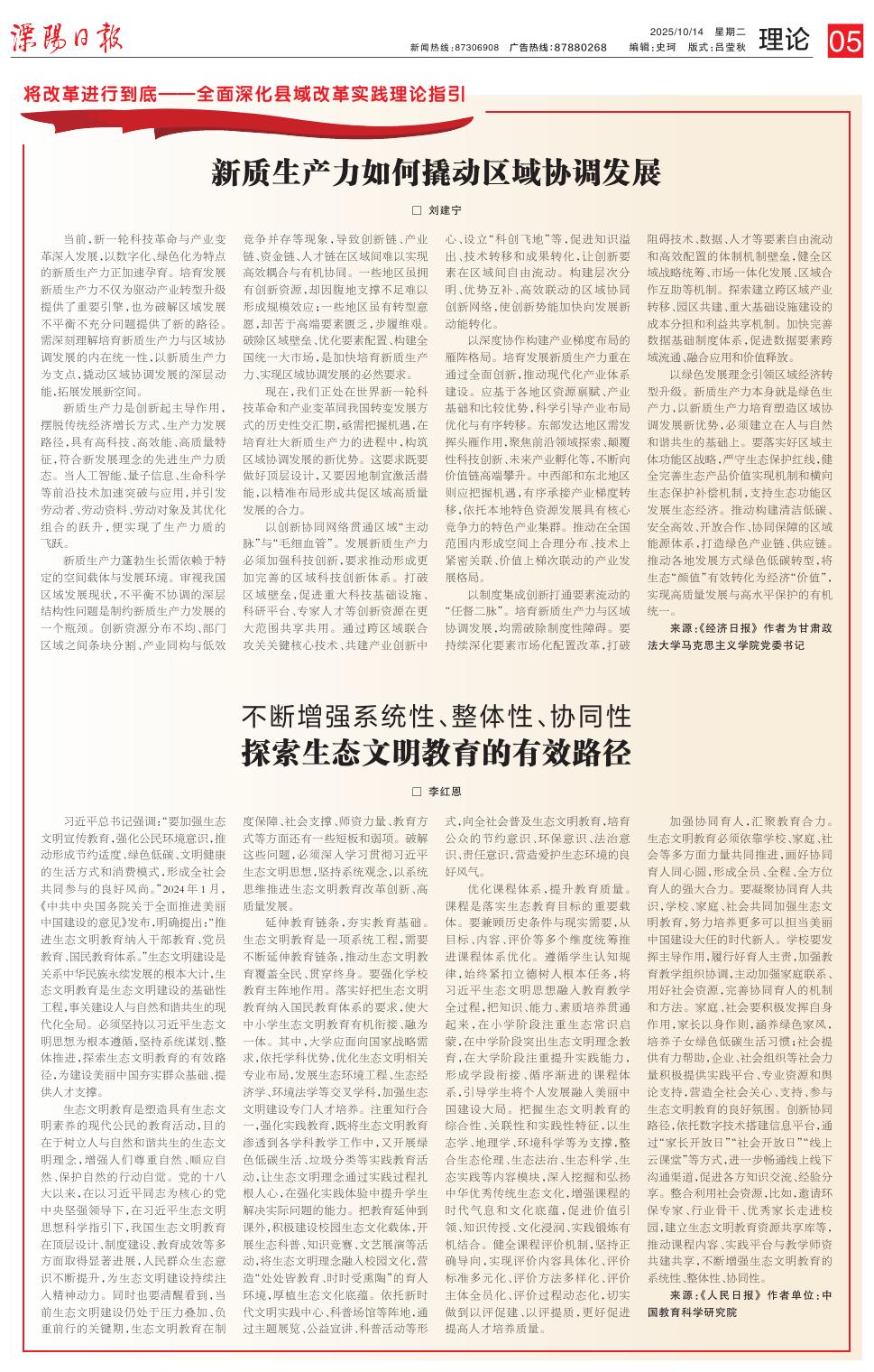 加强协同育人,汇聚教育合力。生态文明教育必须依靠学校、家庭、社会等多方面力量共同推进,画好协同育人同心圆,形成全员、全程、全方位育人的强大合力。要凝聚协同育人共识,学校、家庭、社会共同加强生态文明教育,努力培养更多可以担当美丽中国建设大任的时代新人。学校要发挥主导作用,履行好育人主责,加强教育教学组织协调,主动加强家庭联系、用好社会资源,完善协同育人的机制和方法。家庭、社会要积极发挥自身作用,家长以身作则,涵养绿色家风,培养子女绿色低碳生活习惯;社会提供有力帮助,企业、社会组织等社会力量积极提供实践平台、专业资源和舆论支持,营造全社会关心、支持、参与生态文明教育的良好氛围。创新协同路径,依托数字技术搭建信息平台,通过“家长开放日”“社会开放日”“线上云课堂”等方式,进一步畅通线上线下沟通渠道,促进各方知识交流、经验分享。整合利用社会资源,比如,邀请环保专家、行业骨干、优秀家长走进校园,建立生态文明教育资源共享库等,推动课程内容、实践平台与教学师资共建共享,不断增强生态文明教育的系统性、整体性、协同性。